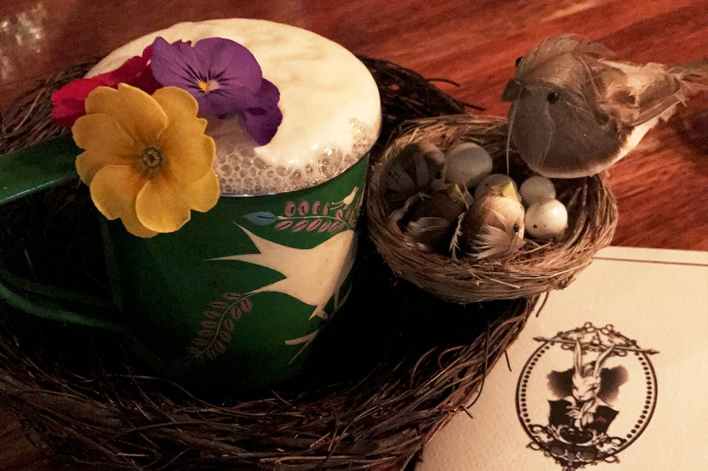 它是如何調(diào)制的?酒單上的配方里寫(xiě)到了羅勒葉浸漬的必富達(dá)金酒、菠蘿蜂蜜和IPA泡沫,不過(guò)調(diào)酒師告訴我里面還用到了檸檬汁。Alice酒吧的雞尾酒出名的地方在它的裝飾,這杯也不例外。可食用花(靈感來(lái)自 Marian Beke掌舵Nightjar期間的創(chuàng)意 ),還有裝在“鳥(niǎo)巢”里的巧克力蛋(有著可口糖衣的那種)完整呈現(xiàn)了Birds and Bees所要表達(dá)的主題。