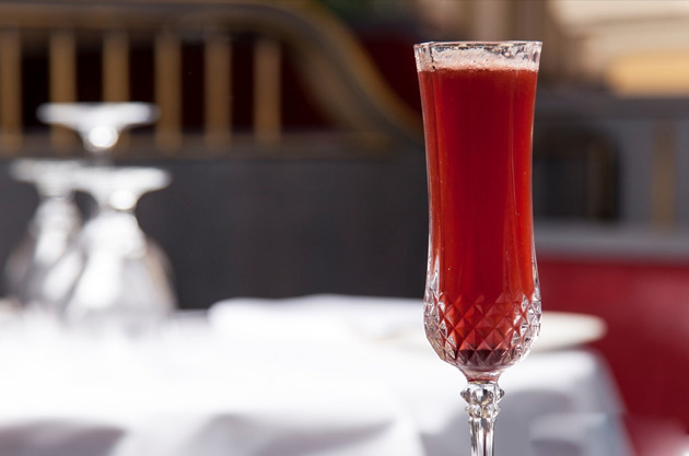 4. 調配雞尾酒:將起泡酒注入一個細長型香檳杯中,再倒入25毫升的香料熱紅酒汁,然后按口味加入檸檬汁進行調和,即可飲用。
