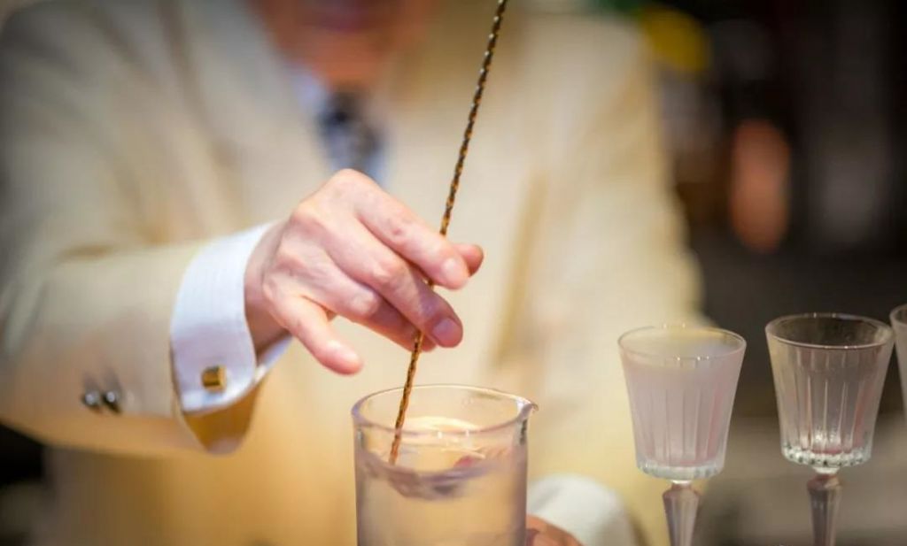 A:這個手法是從東京會館流傳下來的,而我的老師今井先生的Stir手法還稍微有一些不同。要完全熟練掌握這個手法整整花費了20年的時間。Tokyo Kaikan Stir不僅僅看上去很優雅安靜,而且在攪拌的時候可以大幅度地減少冰塊與冰塊,冰塊與攪拌杯杯壁之間的碰撞,并且能夠讓冰塊融化時的出水量保持非常低的狀態。