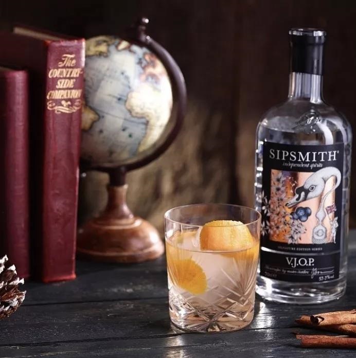 肉桂古典雞尾酒 50ml 希普史密斯V.J.O.P.濃郁金酒、10ml 肉桂糖漿、橙皮裝飾。