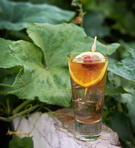 加冰搖勻,濾入加滿冰塊的高球杯中;用姜汁汽水加滿,以一片檸檬和一個櫻桃裝飾。