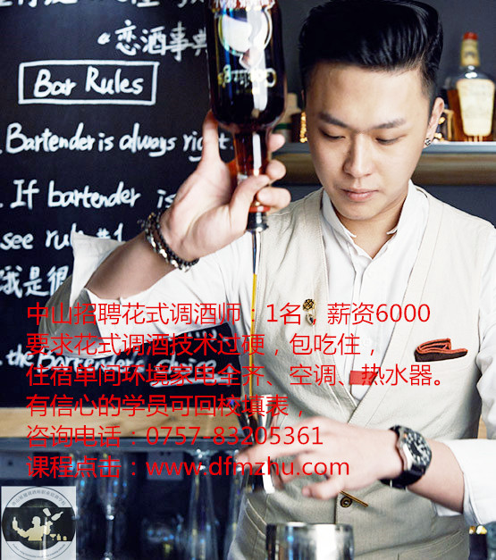 中山招聘花式調(diào)酒師:1名,薪資6000,要求花式調(diào)酒技術(shù)過硬,包吃住,住宿單間環(huán)境家電全齊、空調(diào)、熱水器。有信心的學(xué)員可回校填表,咨詢電話:0757-83205361. 課程點(diǎn)擊:www.jinyunqx.com